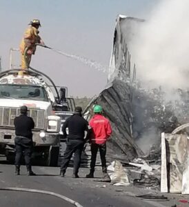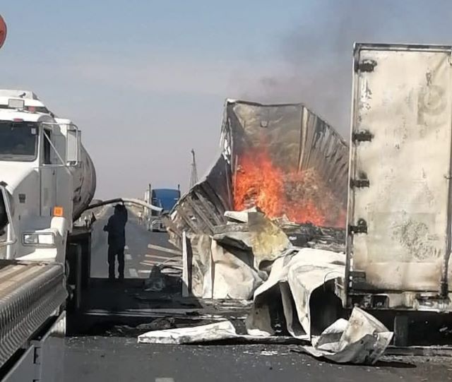 VILLA DE COS, ZAC.- Un chofer murió y otro resultó lesionado tras de que dos tráileres chocaron y se incendiaron en esta localidad.