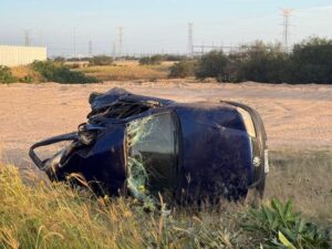 Por su parte, el auto fue proyectado fuera de la carretera y se volcó, quedando recostado sobre su lado derecho.