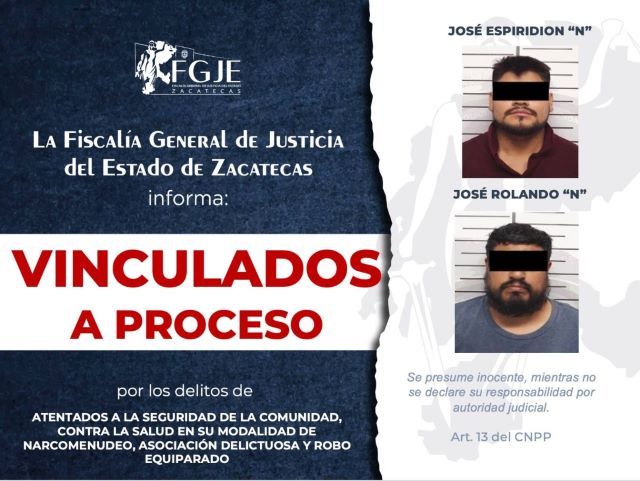 ZACATECAS, ZAC.- El equipo de investigación adscrito a la Fiscalía de Alto Impacto logró la vinculación a proceso por los delitos de atentados a la seguridad de la comunidad, contra la salud en su modalidad de narcomenudeo, asociación delictuosa y robo equiparado en contra de Juan Carlos “N”, originario de Aguascalientes, Gustavo Edain “N”, José Espiridion “N” y José Rolando “N”, a quienes se les impuso medida cautelar de prisión preventiva.