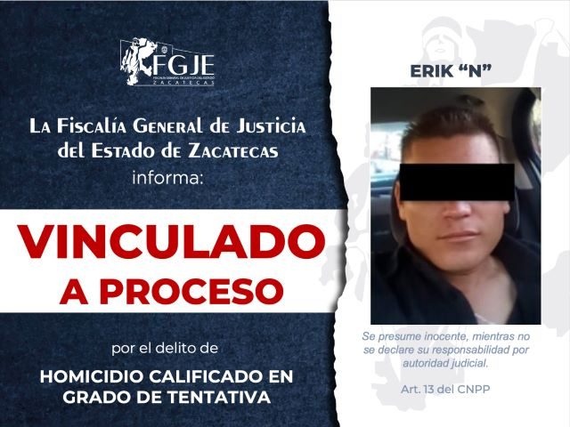 ZACATECAS, ZAC.- La Unidad de Investigación Mixta de la capital logró la vinculación a proceso en contra de Érik “N” por el delito de homicidio calificado en grado de tentativa en perjuicio de una persona; como medida cautelar se dictó prisión preventiva y se establecieron cuatro meses de investigación complementaria.