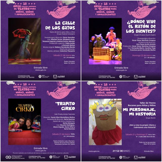 AGUASCALIENTES, AGS.- Este 21 y 22 de marzo disfruta de presentaciones gratuitas en el Teatro Morelos, el Teatro Antonio Leal y Romero y el Patio de las Jacarandas, en el marco del Día Mundial del Teatro para Niñas, Niños y Jóvenes, una celebración que destaca la importancia de las artes escénicas en la infancia y la adolescencia.