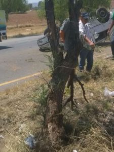 PABELLÓN DE ARTEAGA, AGS.- Cuatro integrantes de una familia se salvaron de morir luego de que el automóvil en que viajaban chocó contra un árbol y luego se volcó de manera impresionante.
