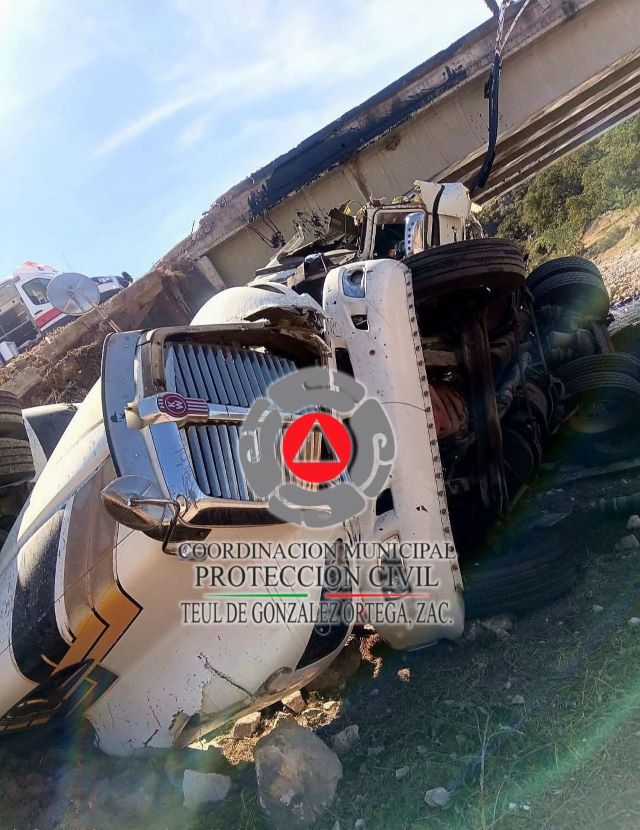TEÚL DE GONZÁLEZ ORTEGA, ZAC.- La volcadura de un tráiler cargado con chapopote dejó a un hombre muerto y a otro lesionado.