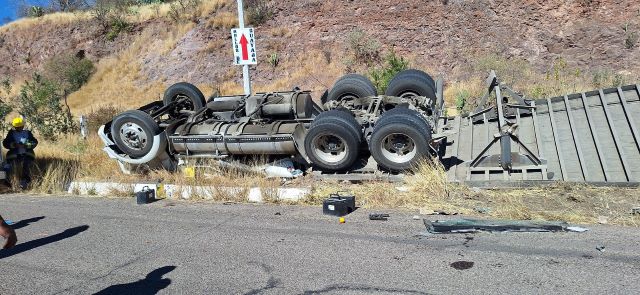 CALVILLO, AGS.- Tras los reportes realizados en el servicio de emergencias 911 sobre un accidente de tránsito tipo volcadura de un tráiler ocurrido en el municipio de Calvillo, éste fue atendido por efectivos de la Secretaría de Seguridad Pública del Estado, Bomberos y Policía Municipal de Calvillo, así como paramédicos del ISSEA, además de la Guardia Nacional; derivado de este percance una persona perdió la vida.