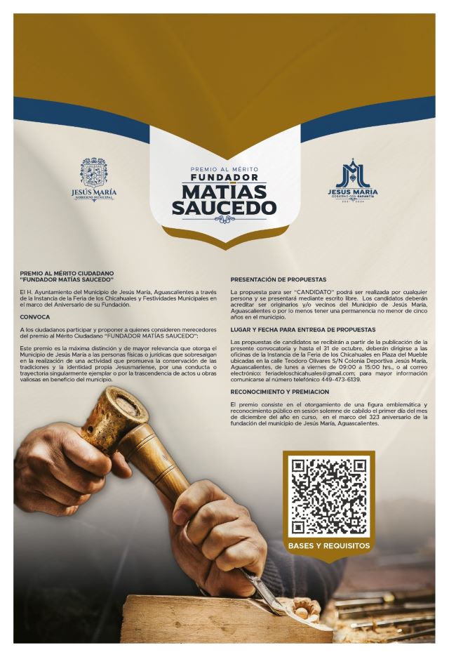 JESÚS MARÍA, AGS.- El Gobierno Municipal de Jesús María informa que ya está abierta la convocatoria para el premio al mérito ciudadano “Fundador Matías Saucedo 2024”, máxima distinción que otorga el Municipio de Jesús María a las personas físicas o jurídicas que sobresalgan en la realización de una actividad que promueva la conservación de las tradiciones y la identidad propia jesusmariense.
